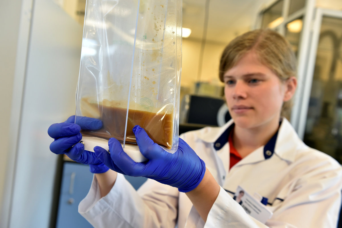A Scientist manipulates a bag that contains faeces in a laboratory at the University of Ghent, Belgium August 23, 2018. The donated faeces will be used to improve the bowel movements of sick patients. Picture taken August 23, 2018. REUTERS/Eric Vidal