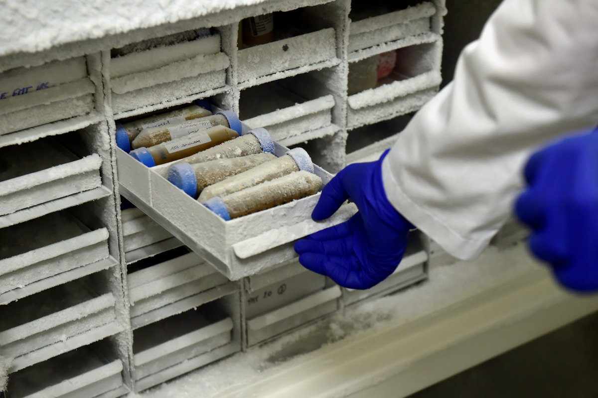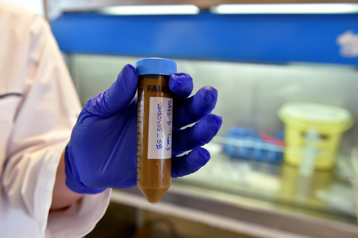 A scientist holds a vial that contains faeces in a laboratory at the University of Ghent, Belgium August 23, 2018. The donated faeces will be used to improve the bowel movements of sick patients. Picture taken August 23, 2018. REUTERS/Eric VidalA scientist pours faeces from a vial into a bag in a laboratory at the University of Ghent, Belgium August 23, 2018. The donated faeces will be used to improve the bowel movements of sick patients. Picture taken August 23, 2018. REUTERS/Eric VidalVials that contain faeces are set in a deep freezer in a laboratory at the University of Ghent, Belgium August 23, 2018. The donated faeces will be used to improve the bowel movements of sick patients. Picture taken August 23, 2018. REUTERS/Eric VidalFrozen vials that contain faeces are set in a deep freezer in a laboratory at the University of Ghent, Belgium August 23, 2018. Picture taken August 23, 2018. The donated faeces will be used to improve the bowel movements of sick patients. REUTERS/Eric Vidal