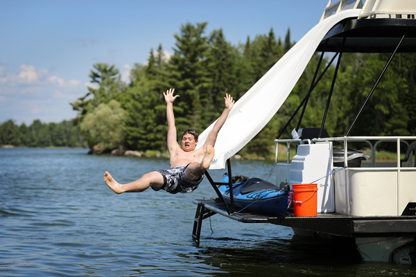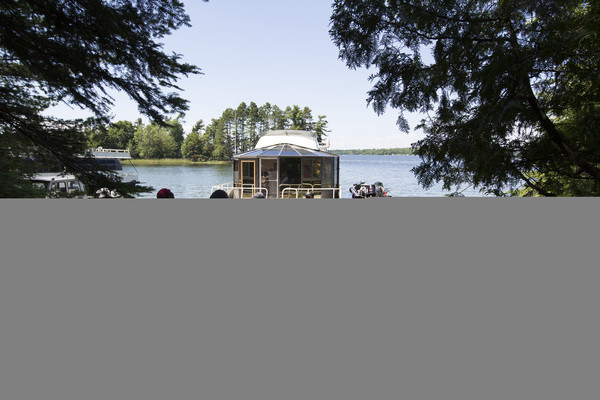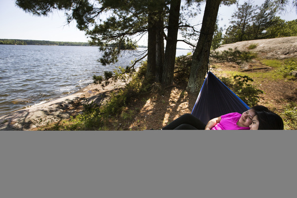 We slipped into a designated houseboat site near the end of a thin peninsula at Blue Fin Bay with plenty of time to play. A short path from the beach led to a fire pit and just beyond that, another beach, where dragonflies divebombed among reeds. As we walked along the sandy shore to a rock outcropping, a common merganser glided past with ducklings perched on her back.