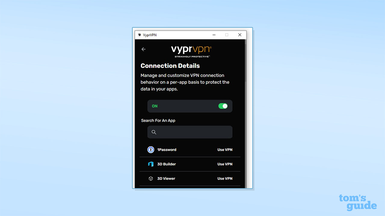 VyprVPN offers split tunneling by app but only on Windows and Android. The feature is labeled “Connection Per App” and allows you to select apps that will bypass the VPN connection. It’s fairly easy to use, but there’s no way to use split tunneling with apps that don’t appear on VyprVPN’s app list.