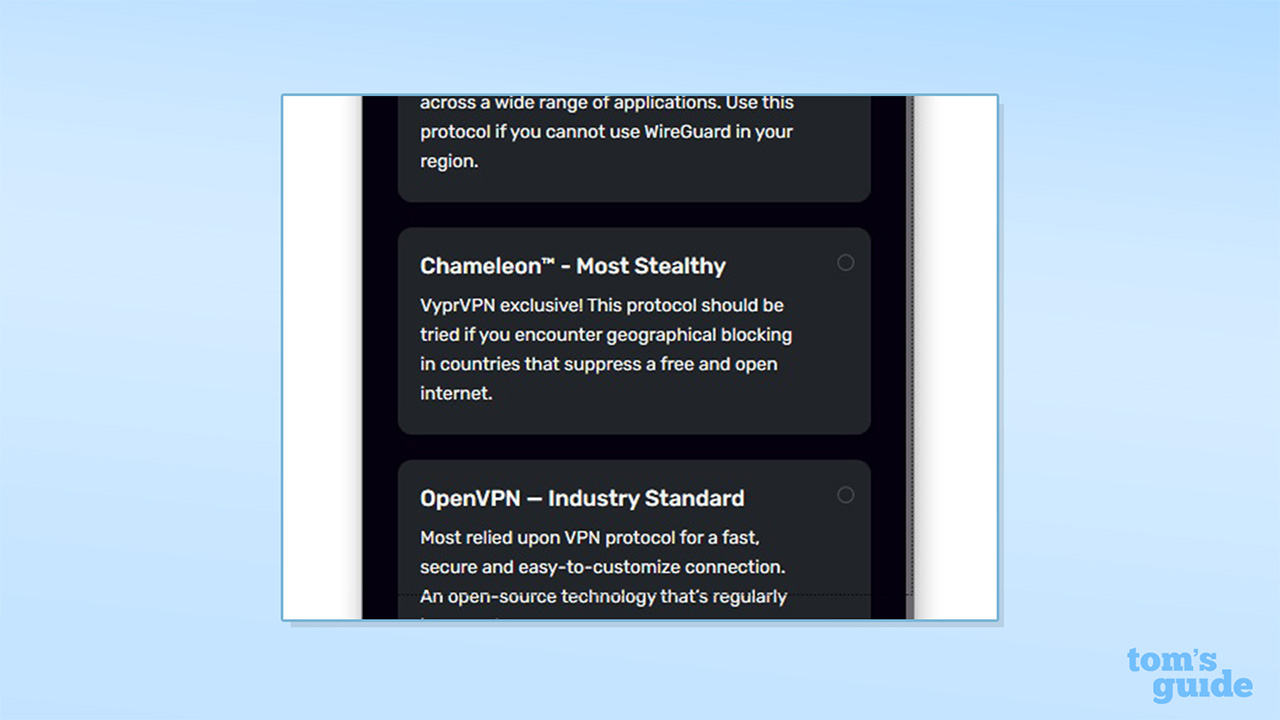 When it comes to encryption, VyprVPN offers a reasonable spread of modern, secure VPN protocols for all platforms, including WireGuard, OpenVPN, and Chameleon, its own proprietary protocol.