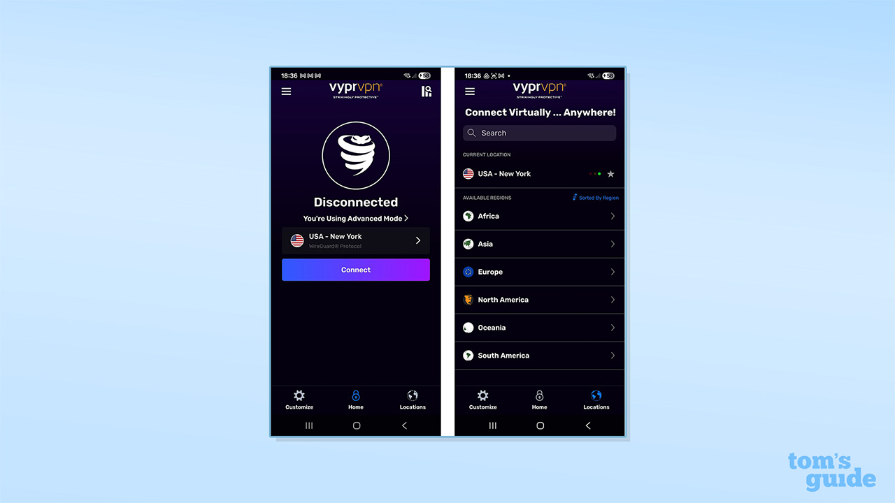 VyprVPN’s apps look and feel much like most other VPN apps, with a portrait window, a large “Connect” button, and your currently selected server option on display. The apps are easy to install, consistent across platforms, and it’s easy to find the server list and settings options.