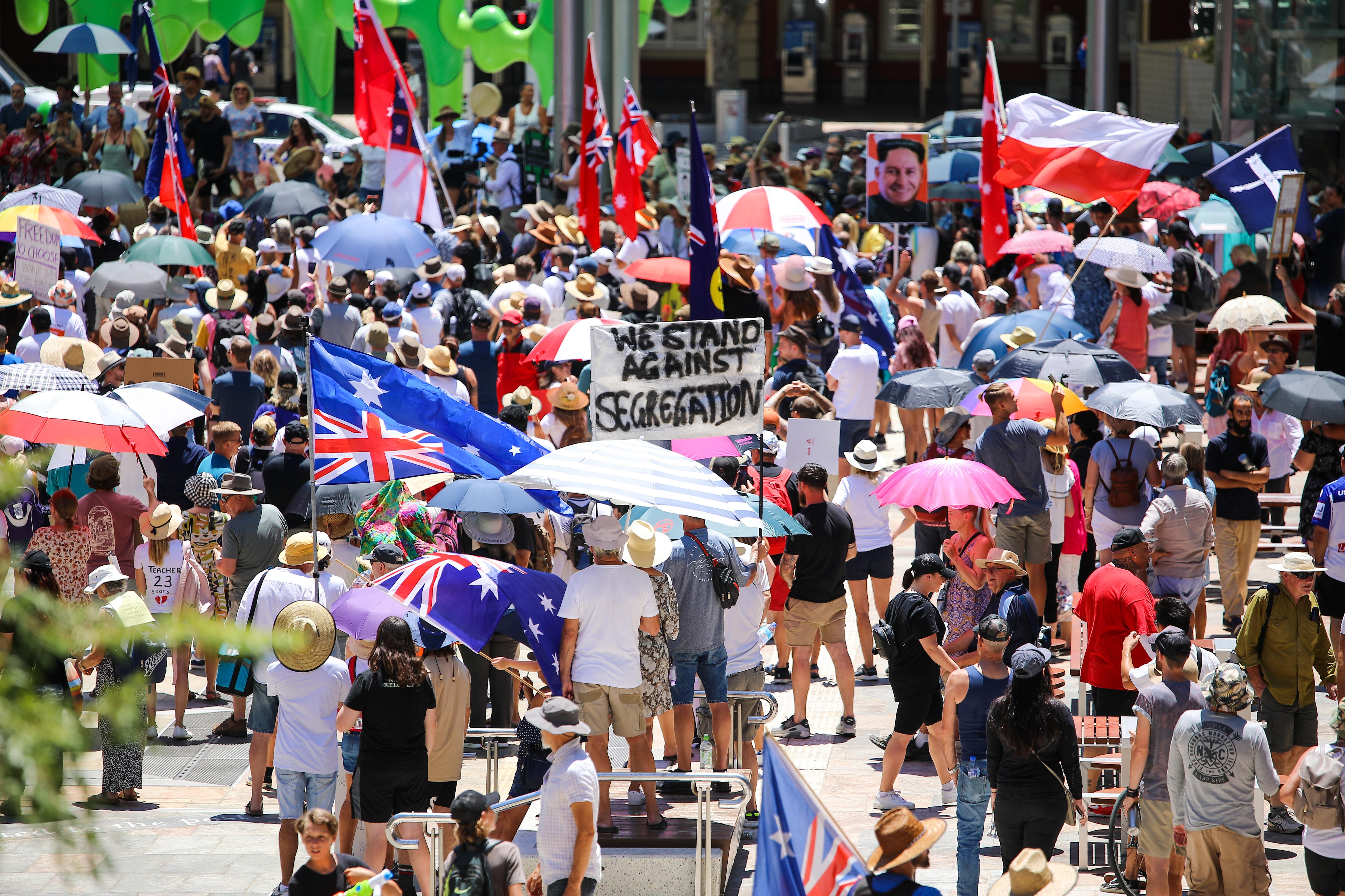 Some in the crowd flew flags of other nations, while others held banners criticising the vaccination policy.