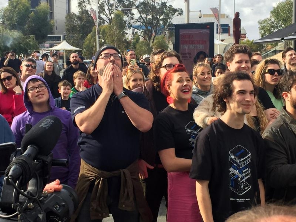 A small crowd gathered to cheer and countdown to a live broadcast of the launch at Yagan Square in Perth, where it will replay on a digital tower for the next week.