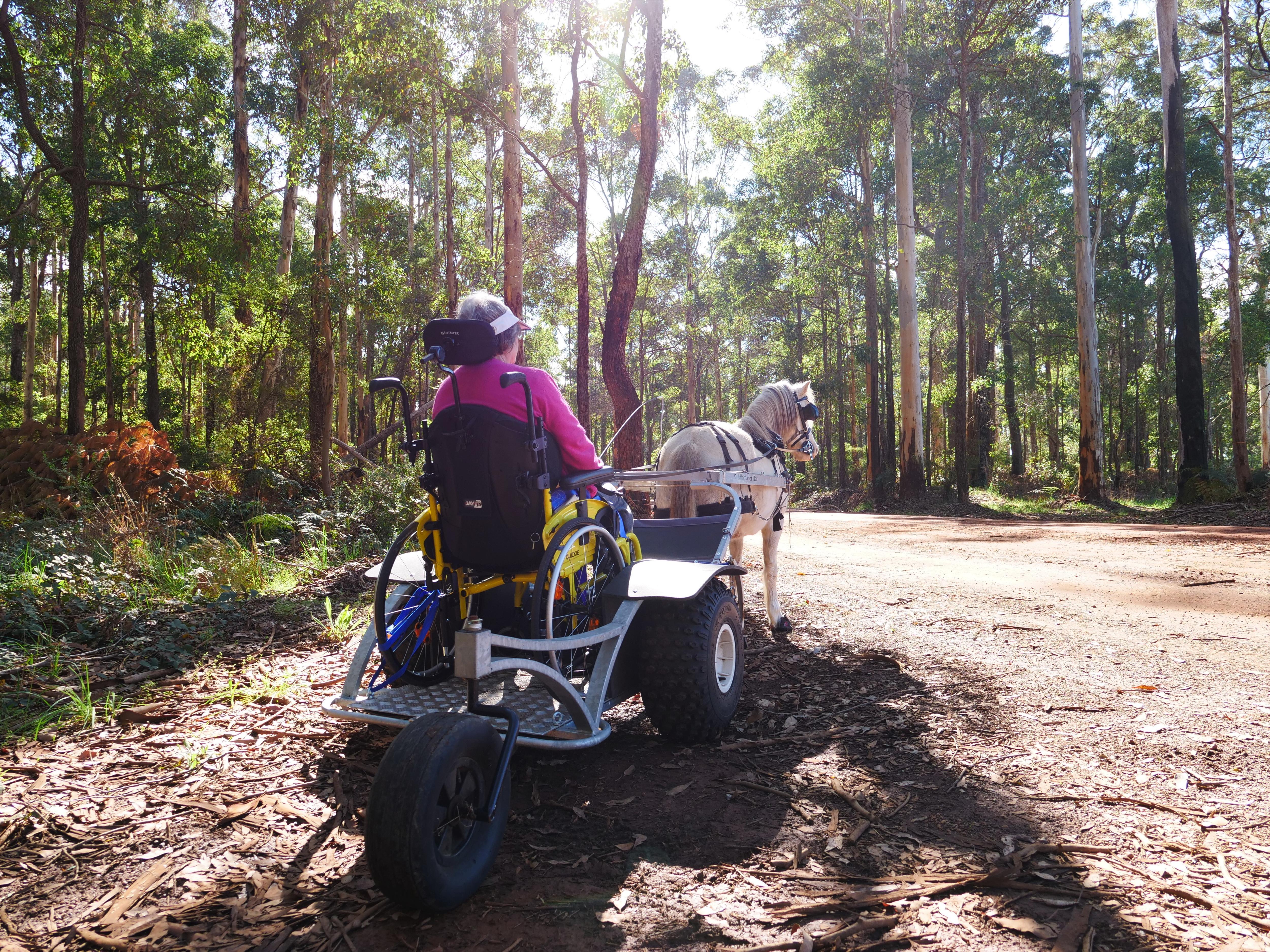 She sits comfortably in her wheelchair, taking in the scenery as her trusty pony pulls her along.