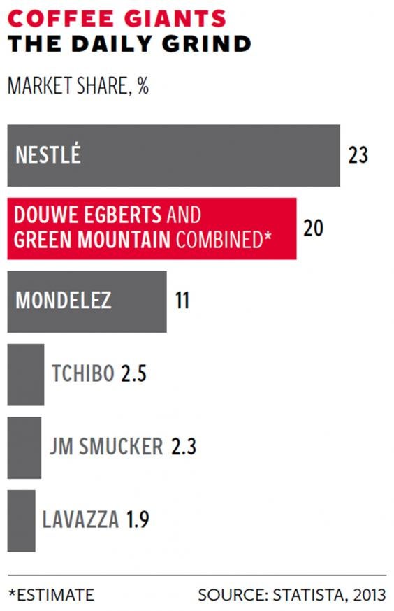 The acquisition of Keurig Green Mountain offered JAB a rare opportunity to make up some of the gap between itself and the world leader Nestlé, whose Nespresso machine is advertised by George Clooney. The combined company will control just under 20 per cent of the global coffee market, around 3 per cent less than Nestlé. Just as the beer industry is consolidating into a handful of consolidated super brands, so JAB is attempting to do the same thing with the coffee market.
