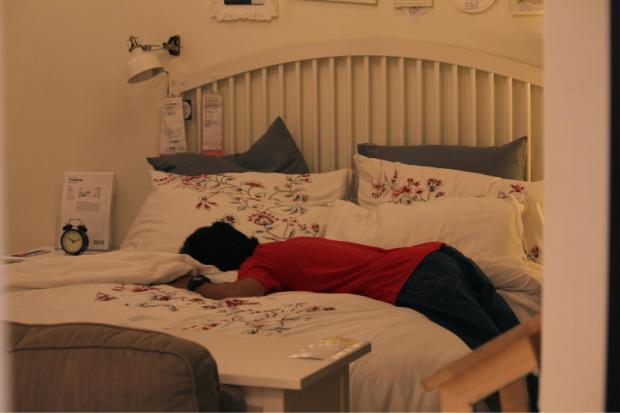 Cut to a corner of IKEA, a middle-class family is spending its day off selecting bedroom furniture. They fall asleep on the soft mattress and sofas, out of exhaustion from working so hard to pay for their "dream bedroom". Pabhawin captures this series of photos with sympathetic humour.