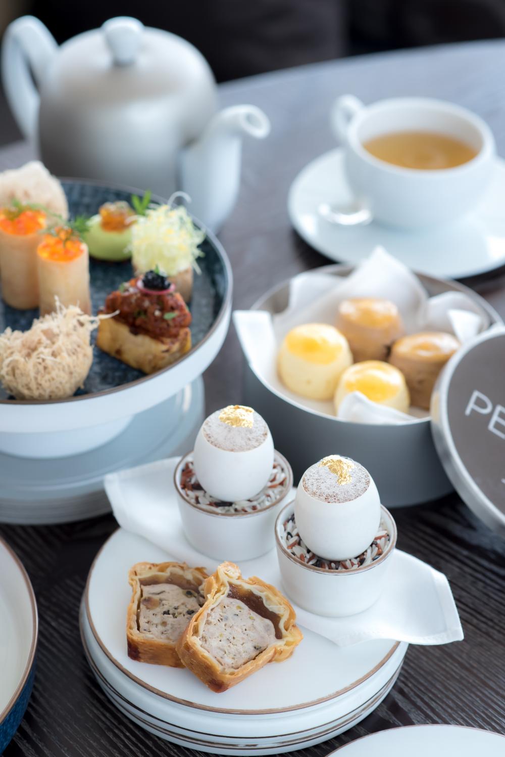 The afternoon tea comprises a 15-item selection of finger sandwiches, savoury pastries, sweet pastries and desserts, accompanied by a warm pot of loose-leaf tea. Each set, a total of 28 bite-sized pieces plus a sharing cake and two choices of drink, serves two diners.