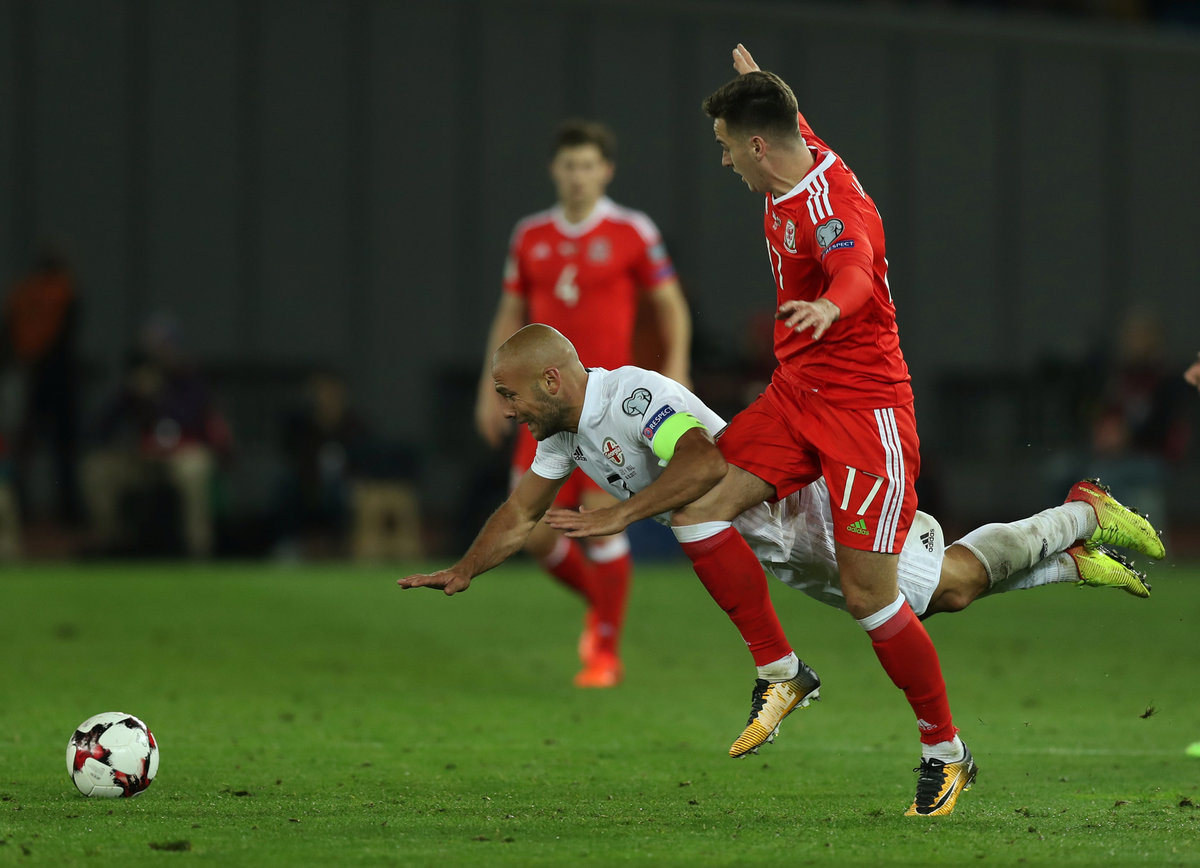 Soccer Football - 2018 World Cup Qualifications - Europe - Georgia vs Wales - Boris Paichadze Dinamo Arena, Tbilisi, Georgia - October 6, 2017 Wales' Andy King in action with Georgia’s Valeri Qazaishvili REUTERS/David Mdzinarishvili