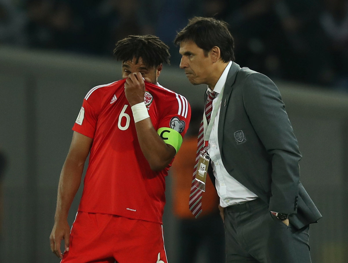 Soccer Football - 2018 World Cup Qualifications - Europe - Georgia vs Wales - Boris Paichadze Dinamo Arena, Tbilisi, Georgia - October 6, 2017 Wales manager Chris Coleman speaks with Ashley Williams Action Images via Reuters/Peter Cziborra
