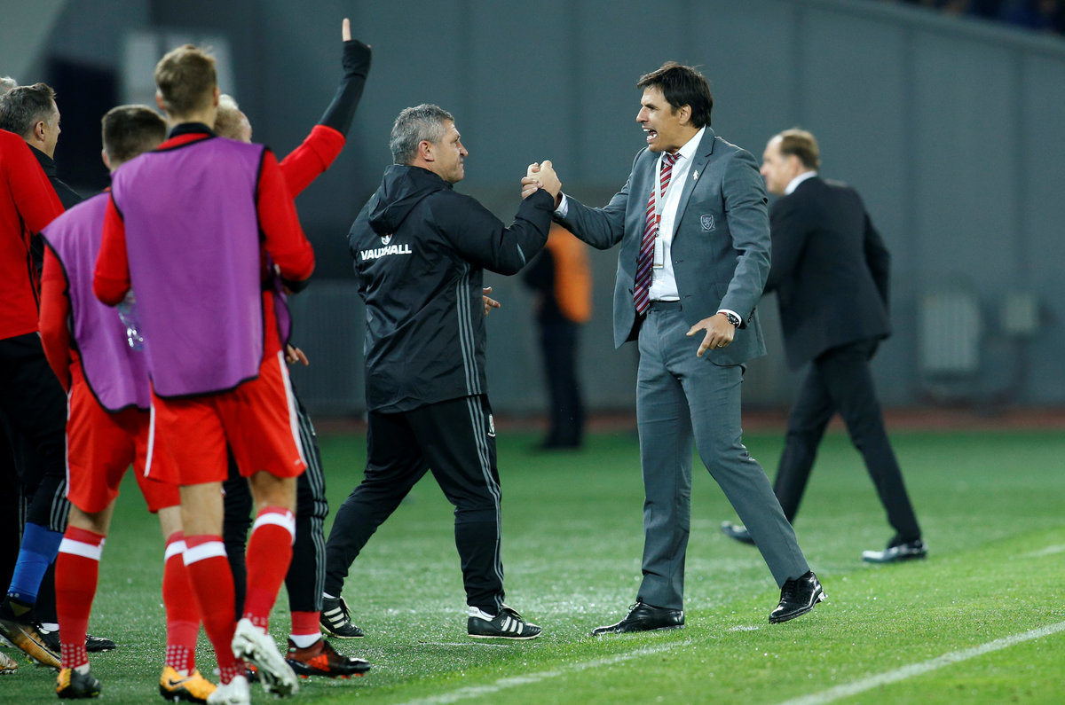 Soccer Football - 2018 World Cup Qualifications - Europe - Georgia vs Wales - Boris Paichadze Dinamo Arena, Tbilisi, Georgia - October 6, 2017 Wales manager Chris Coleman celebrates with assistant manager Osian Roberts after Tom Lawrence scores their first goal REUTERS/David Mdzinarishvili
