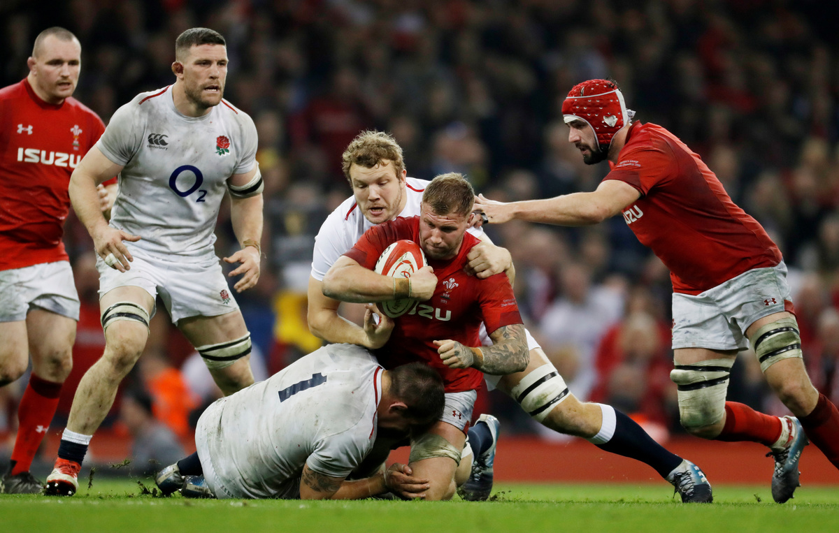 CARDIFF (Reuters) - Wales blew the Six Nations wide open with an epic 21-13 victory over England on Saturday as late tries for Cory Hill, after a monumental 34-phase goal-line assault, and Josh Adams at the death secured a national record 12th successive victory.