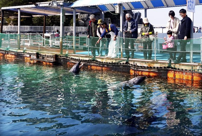 The attractions on Irukajima on the Youra Peninsula in Tsukumi include dolphin shows, and opportunities to take photos with and feed dolphins.