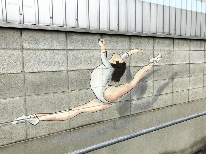 As I continued my stroll through ordinary-looking residential roads, I found myself under the gaze of Maetel, a character in the popular anime series "Galaxy Express 999," and then encountered a female gymnast performing a high jump over a car stopper made to look like a balance beam.