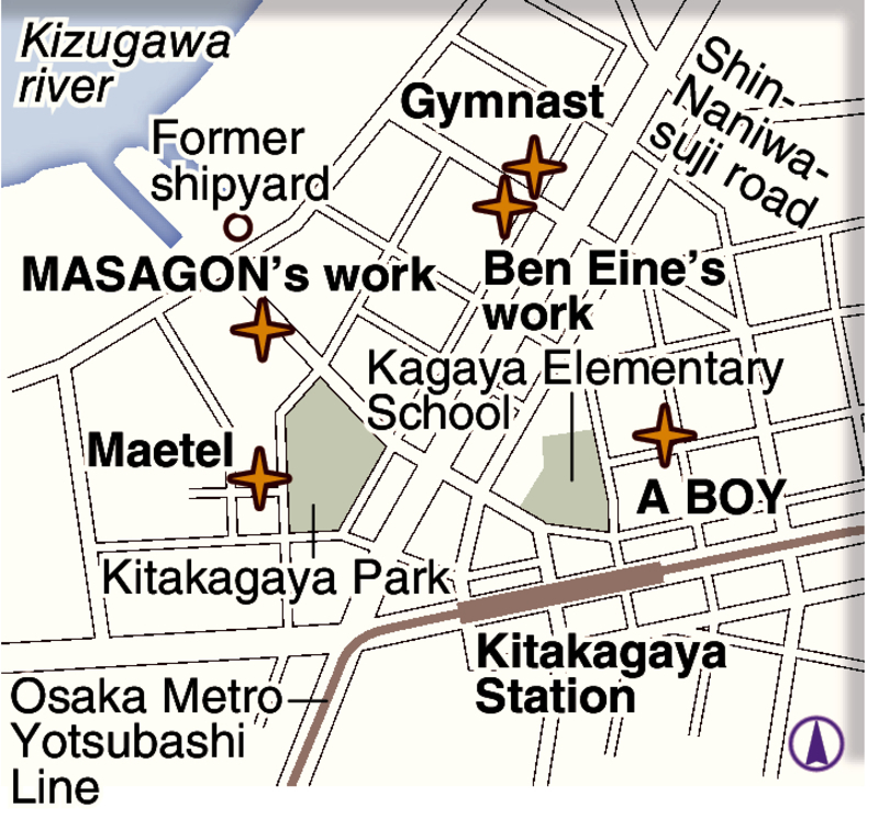 About a five-to-10 minute walk from Kitakagaya Station on the Osaka Metro's Yotsubashi Line. Facilities converted from old shipbuilding yards and warehouses are scattered about, including a theater and studio, a gallery and a cafe. MASK, a facility converted from a factory, stores artwork by contemporary artist Kenji Yanobe and others, and holds exhibitions once a year. For event and other information, visit the Chishima Foundation for Creative Osaka's website at http://www.chishimatochi.info/found/information/