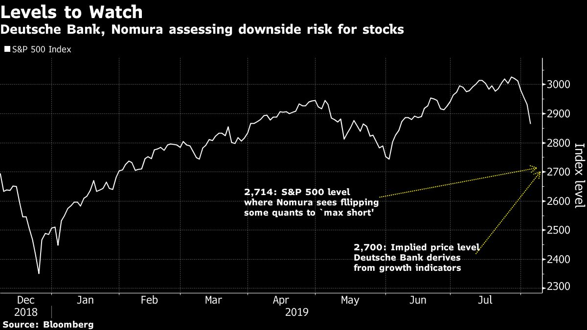 Deutsche Bank isn’t the only one that focuses on quant funds to gauge the market’s potential downside. At Nomura, Charlie McElligott, a cross-asset strategist, estimates that a decline in the S&P 500 to 2,830 would flip some funds to bet against stocks. A “maximum short” position would be triggered when the index falls below 2,714, he says.