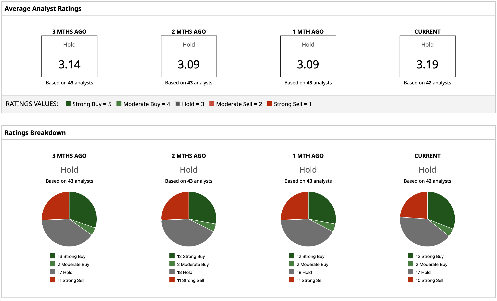 TSLA has a “Hold” rating consensus and an average price target of $345, a potential downside of ~19% from current levels, reflecting valuation issues even from bullish analysts. Prices vary considerably—from $120 on the low end to $600 on the high end, reflecting disagreement over how to price Tesla's combination of automotive and AI optionalities.