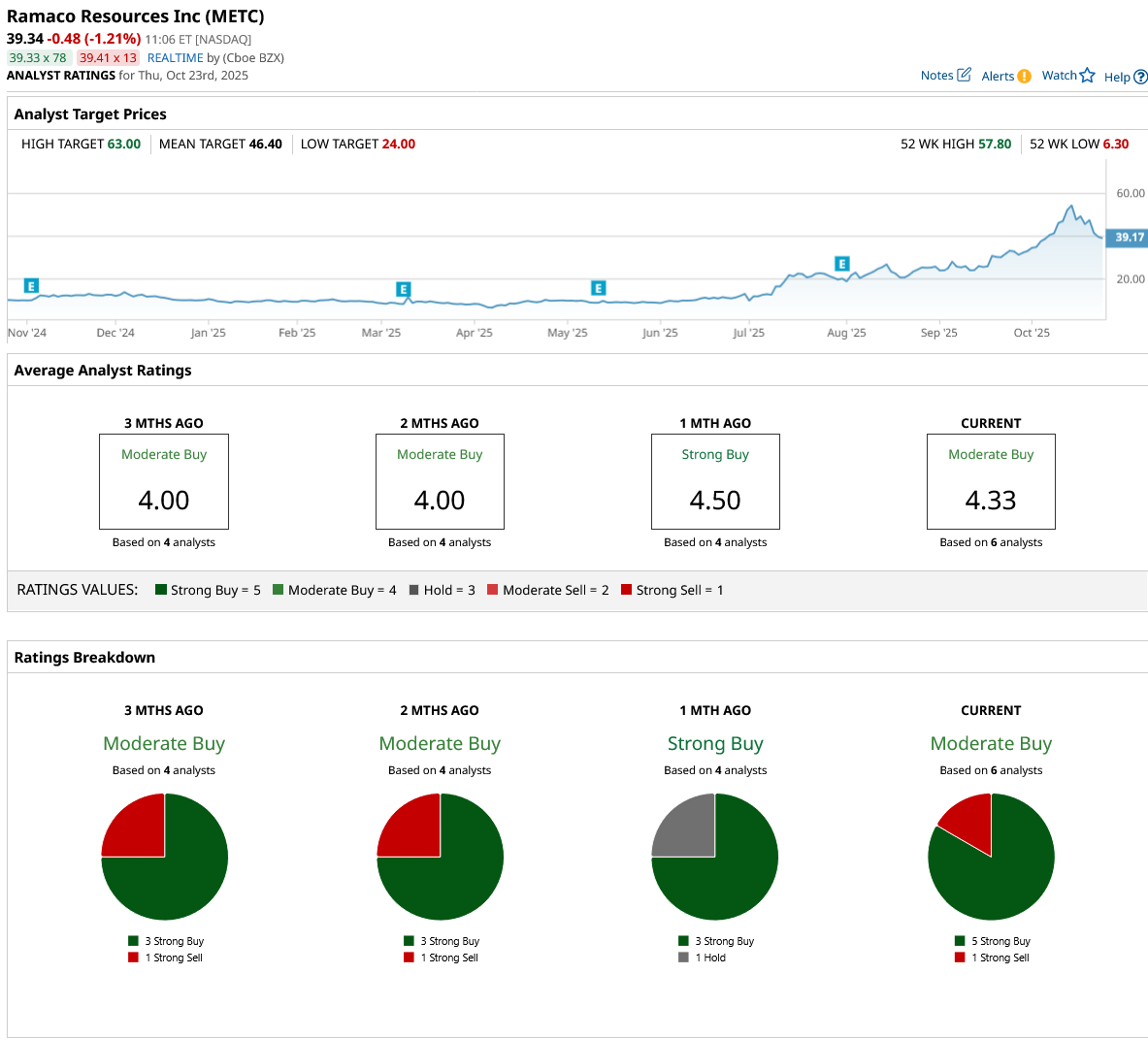Wall Street analysts have a consensus rating of “Moderate Buy” on METC stock. Of the six analysts covering the stock, five rate it a “Strong Buy,” while one assigns a “Strong Sell” rating. Following a recent pullback from its all-time high, likely driven by profit-taking, METC stock is now trading below its average price target of $46.40. Notably, the stock offers a 60% upside potential to the Street-high price target of $63 (set by Baird analyst Ben Kallo).