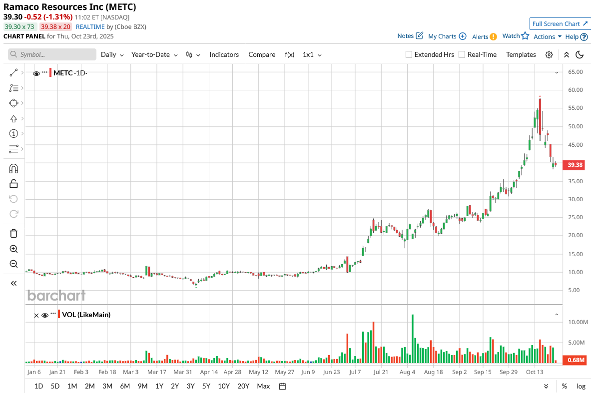 Shares of the coal and rare earth minerals producer have spiked 283% on a year-to-date (YTD) basis. The rally was primarily driven by the company’s strategic expansion into REE and critical minerals after discovering that its Brook Mine asset in Wyoming contains a significant deposit of these materials. This shift has garnered investor attention, especially as China, a dominant player in the REE market, continues to tighten export restrictions.