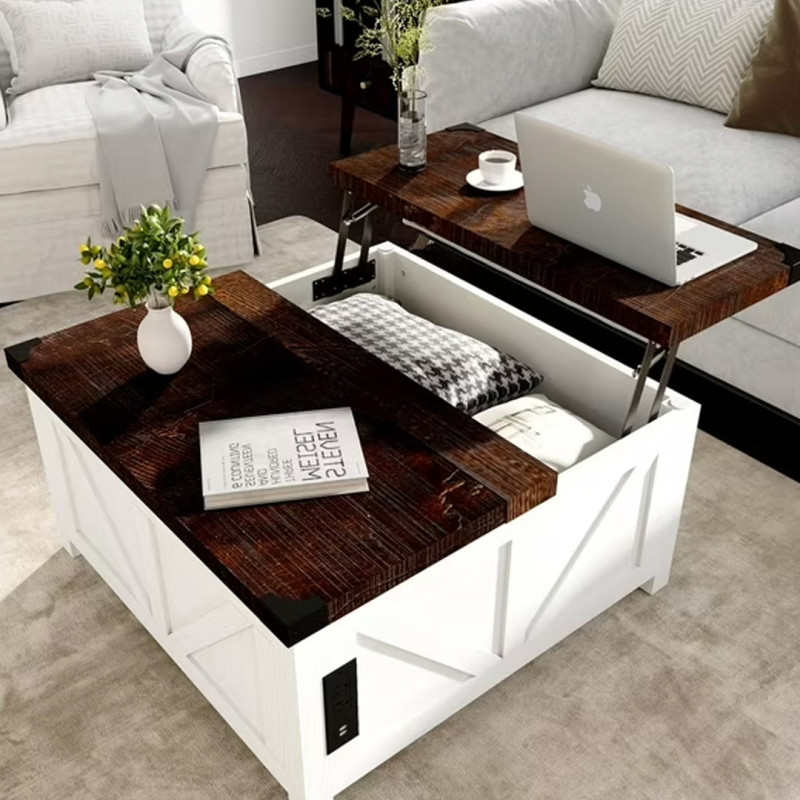Unlike many other lift-top coffee tables, this one hides its modular features quite well. When the top is lifted, it exposes a large storage space for throws, pillows, or anything else you may want to hide. It also includes multiple USB ports and power outlets, sturdy metal lift brackets, and rustic farmhouse design cues. In addition to hiding the storage space beneath, the lift-top platform is perfect for eating meals in front of the TV. If you don't want to miss your chance at one of the best looking lift-top coffee tables on the market, then put one in your cart ASAP.