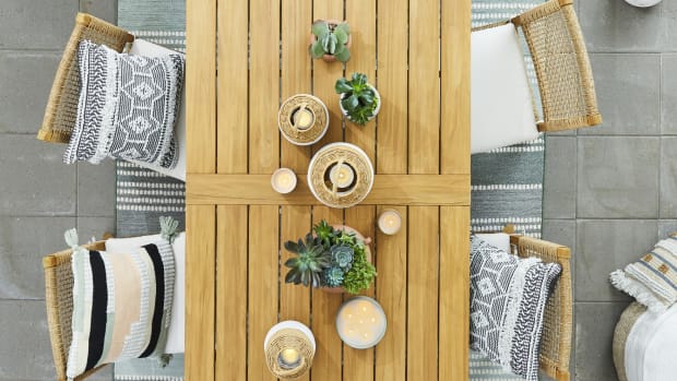 The Walmart-exclusive collection debuts with 30 outdoor home and décor items including planters, rugs, throw pillows, lanterns, a wide porch swing, and an outdoor dining table.