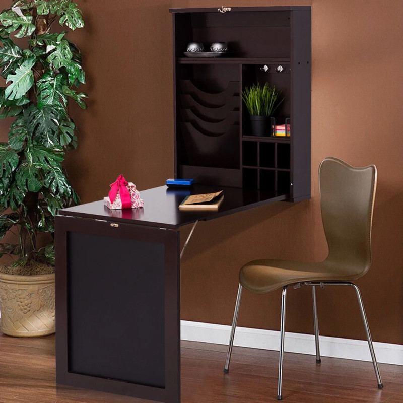 There is so much to praise about this desk, but the most obvious is its hideaway design. When not in use, the desk folds up into a wall-mounted chalkboard that's useful for grocery lists or any other important reminders. The lightweight but sturdy desk easily pulls down from the wall and rests on the floor for immediate use. When in the down position, the interior cabinet reveals multiple adjustable shelves, storage nooks, hanging hooks, and paper organizers. The wall-mounted chalkboard measures approximately 24 by 30 inches. All hardware needed for mounting is included and the desk comes in two different colorways. It also includes chalk and an eraser for the blackboard.