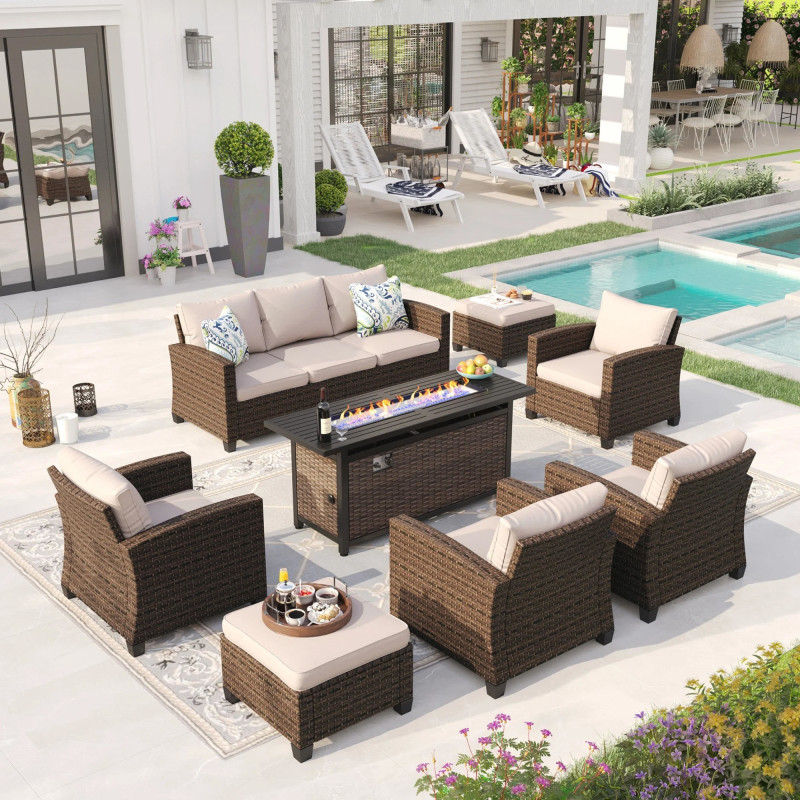The 8-piece set includes a three-seat sofa, four single chairs, two ottomans, and a fire table. Shoppers can choose from the beige, which is the most discounted, or the aqua blue. The contemporary design of the set offers a beautiful addition to any outdoor space.