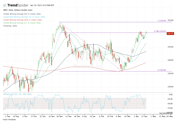 Walmart stock has rallied off the $136 level and the 200-day moving average. Recently, the shares pulled back to short-term support via the 10-day moving average and are trying to rotate higher.