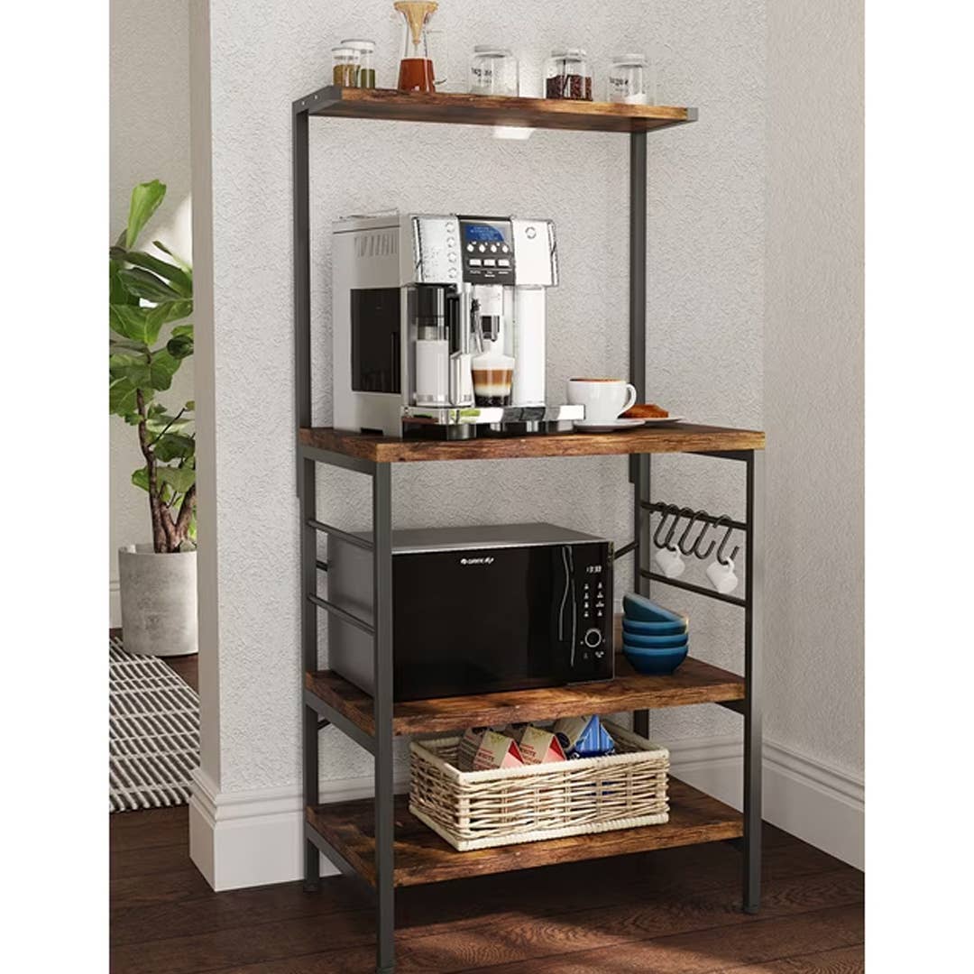 This is one of the most versatile pieces of furniture you can get since it can be used in a variety of ways. It has three full-sized shelves and one half-shelf that can be used to store coffee supplies, pantry items, or even decor. It is made of steel and wood, so it's stable and sturdy but blends in nicely with almost any kitchen aesthetic. The coffee bar also includes adjustable leg pads, hanging side hooks, and high shelf clearance to accommodate larger kitchen appliances. It can be ordered in two different color options.
