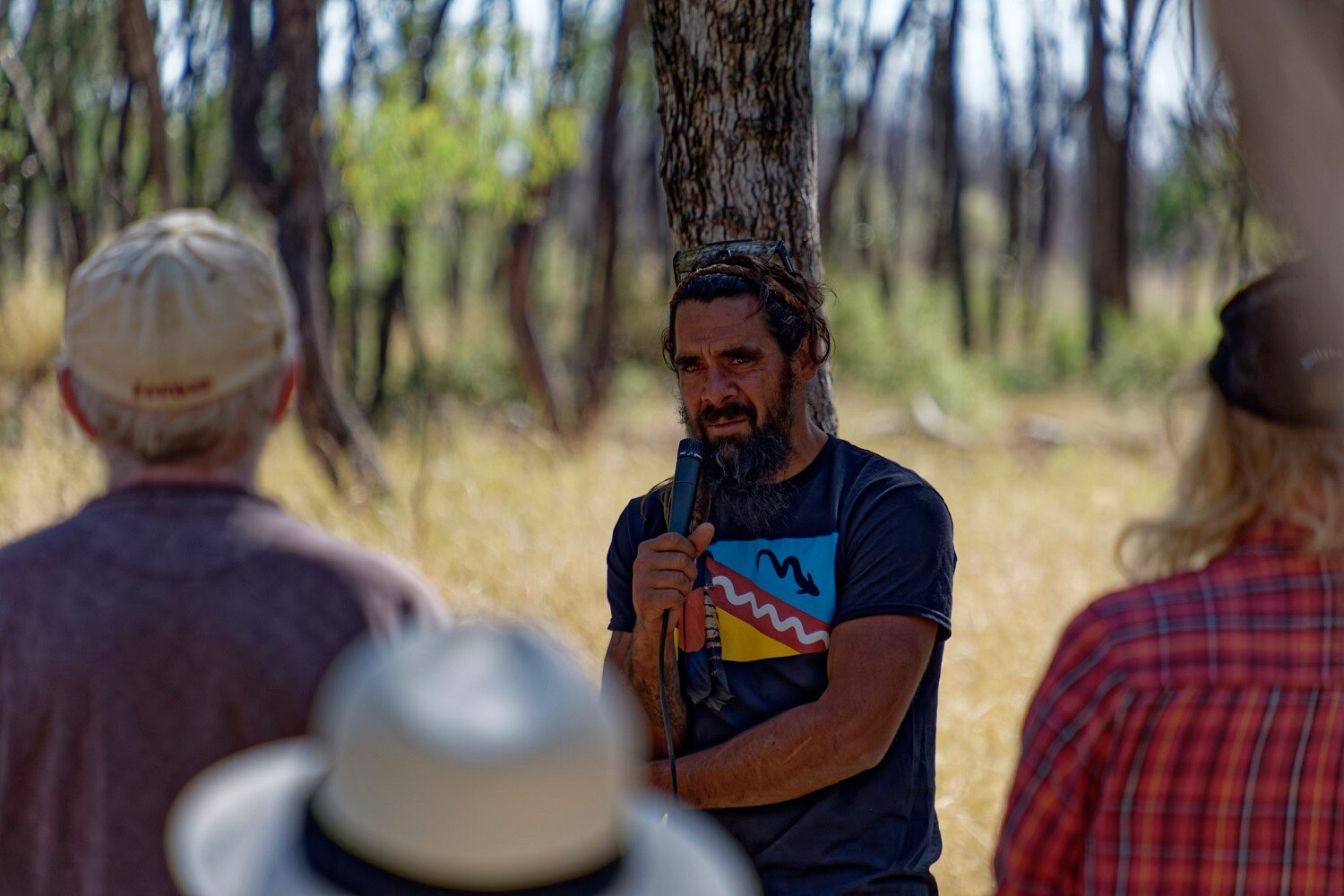 Within a large stone Bora circle, a ceremonial fire has been burning non-stop for the past 365 days, attended continuously by a member of the Wangan and Jagalingou people.