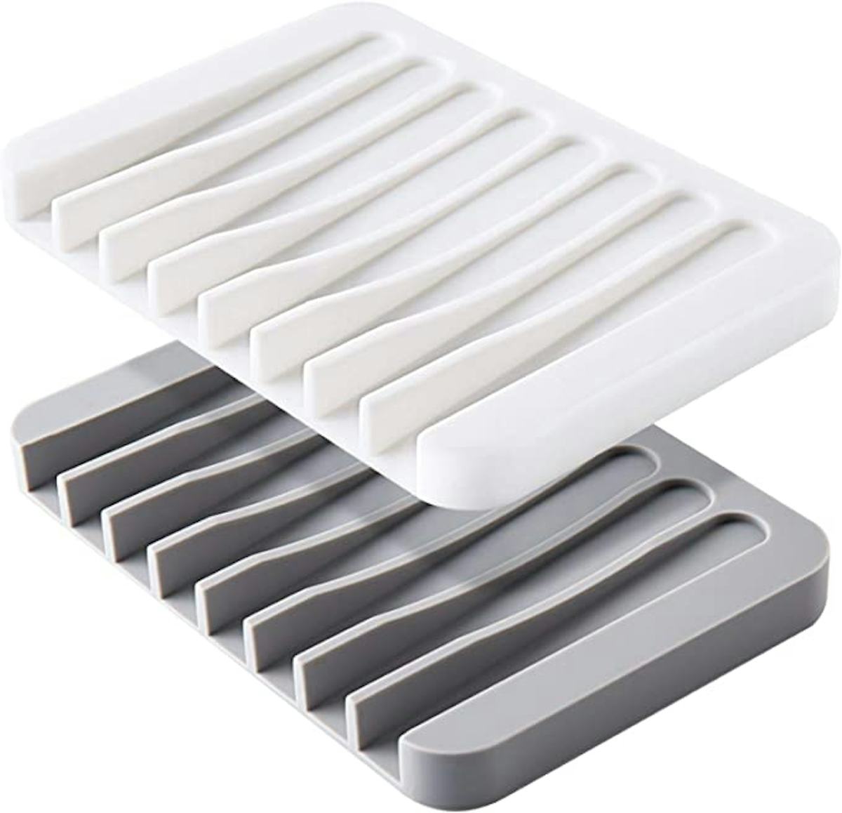 Stack mugs, cups, and glasses on top of one another in your kitchen cabinets with these plastic stackers — this way, you can utilize more of the vertical space that’s available. They offer a firm grip to your drinkware to avoid toppling, and the stackers are dishwasher friendly.