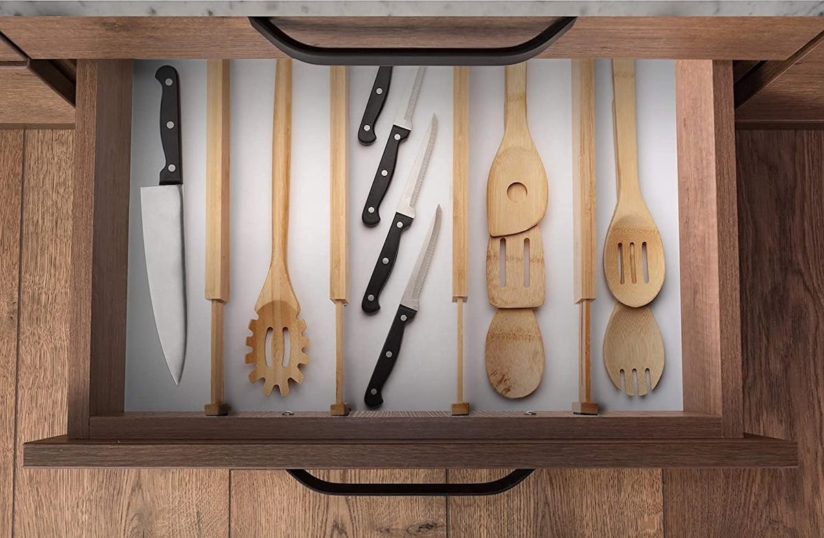 Kitchen drawers a disaster? Utilize these adjustable dividers to create designated storage spots for utensils, kitchen scissors, and whatever else you keep in there. The four bamboo dividers extend from 17.5 to 22 inches and can be positioned vertically or horizontally.