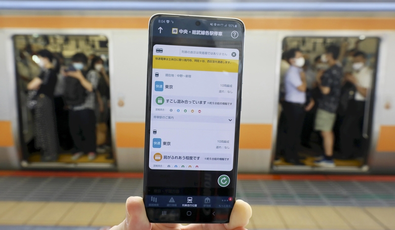 It's 8 a.m. on a weekday morning in early August and a passenger waiting on the Chuo Line's rapid service platform at JR Shinjuku Station in Tokyo opens an app on their smartphone and selects the "trains bound for Tokyo" option. The screen displays a message saying the trains are slightly congested.