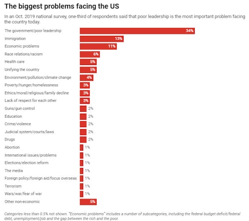 For example, in October, Gallup found that 34% of Americans cited “the government/poor leadership” as the most important problem facing the country, 13% cited immigration and 11% said the economy.