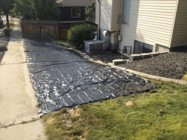 The idea is to cook the grass under the tarp. I turned off the sprinklers in that area and left the black plastic on the strip for the rest of the summer and through the winter.