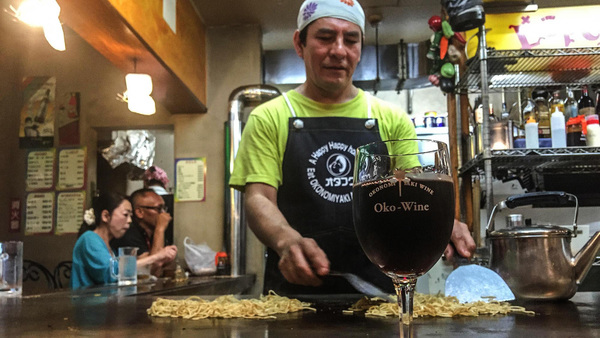 Lopez pours the Spanish vino at his counter and hands patrons a brochure touting the wine's "round tannins with less bitterness," which the vintners say is essential so as not to conflict with the savory umami taste of okonomiyaki.