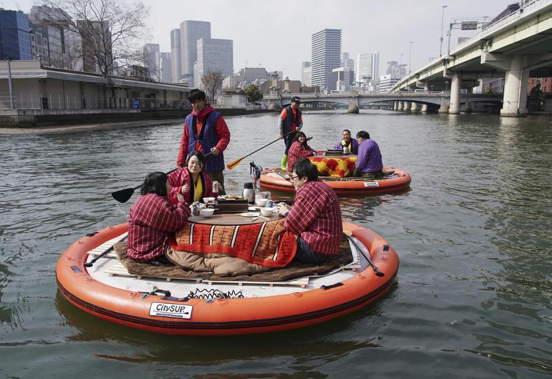 People clad in dotera quilt jackets enjoy a river view of central Osaka while sitting around kotatsu heated tables set on round paddle boards on Saturday. During the about 40-minute river tour, the 3-meter diameter paddle boards took tourists around the city's Nakanoshima Park while they had grilled mochi. Organized by Japan CitySUP Association, the event will also be held on Feb. 23 and March 2, aiming to attract more people to enjoy Osaka's river view.