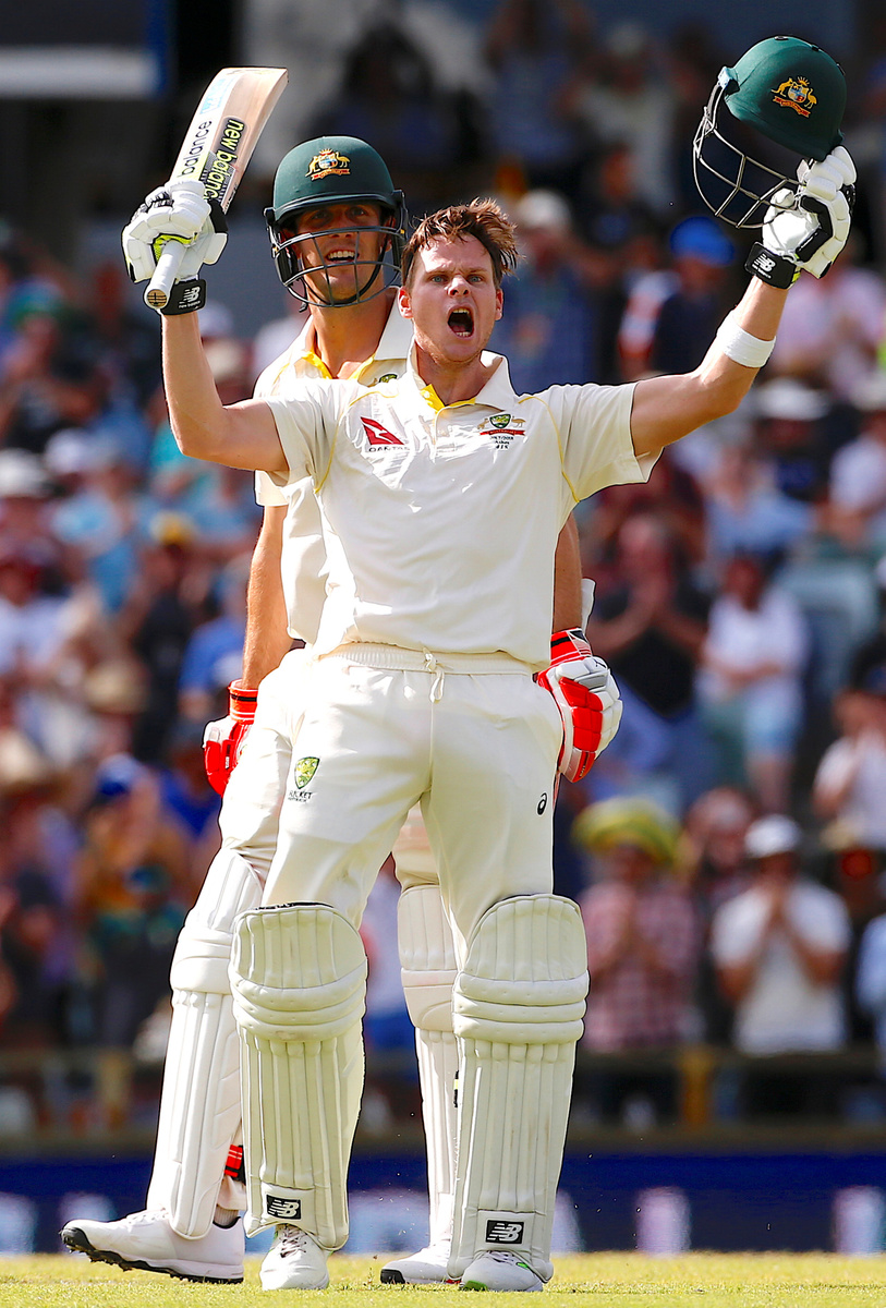 Cricket - Australia v England - Ashes test match - WACA Ground, Perth, Australia, December 16, 2017 - Australia's captain Steve Smith celebrates reaching his double century during the third day of the third Ashes cricket test match. REUTERS/David Gray