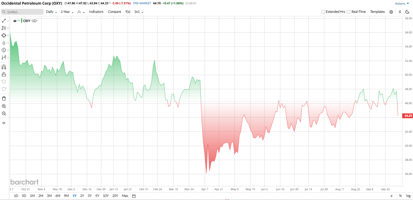 On Oct. 2, Occidental Petroleum (OXY) shares dropped more than 6% following the announcement, highlighting ongoing investor caution related to the Berkshire Hathaway deal. Year-to-date (YTD), as of early October 2025, the stock has hovered in the mid-$40s, marking a 10% decline for the year. The weakness mirrors broader energy sector struggles, as oil prices fell to four-month lows in September on oversupply worries.