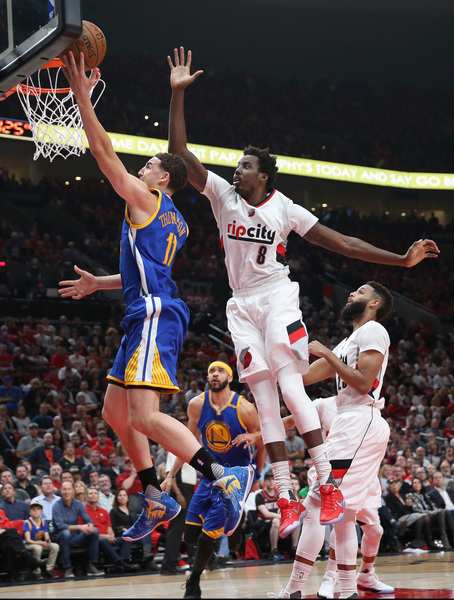 Thompson made his first four 3s in the third quarter, including a personal 8-0 run, where he sandwiched two free throws with two big 3s. The second of which was set up by a ferocious McGee and Steph Curry trap at halfcourt, forcing McCollum into a rushed pass, which was stolen by Thompson. The 3 brought the Warriors within four.