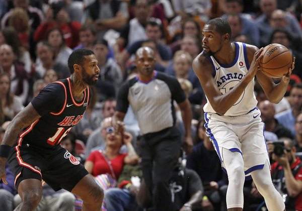 The Warriors (18-6) opened the second half with Kevin Durant throwing down a baseline dunk. They continued a 12-2 run with Stephen Curry scoring 10 of his team-leading 30 points before Miami called timeout as it trailed, 78-63, with 7:19 remaining. They ended the third quarter with a 99-77 lead over the Heat after outscoring them, 37-17.