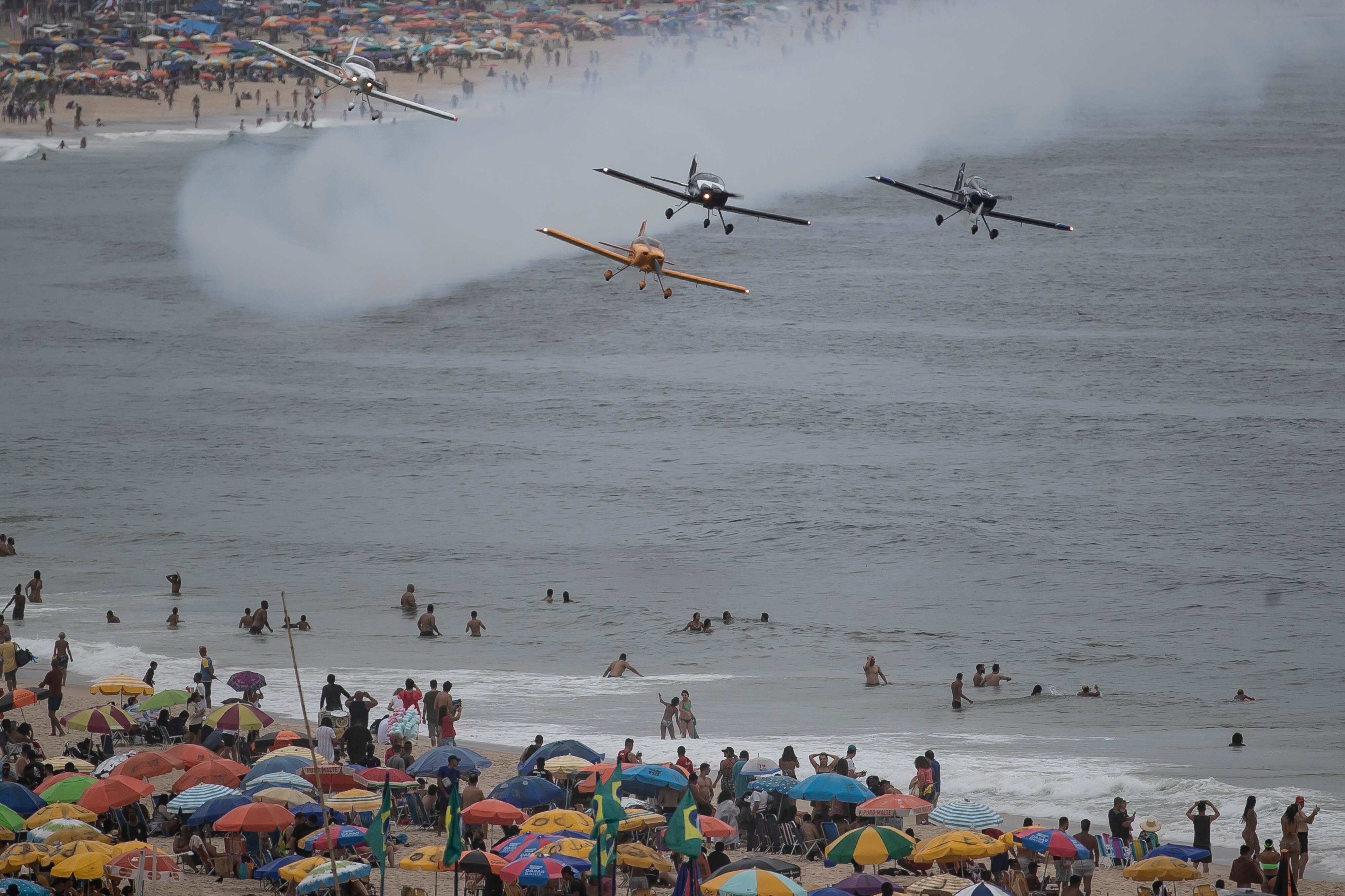 In Rio de Janeiro, as residents and tourists prepared to party and watch a fireworks display from Copacabana Beach, The Smoke Squadron put on an aerial show for beachgoers.