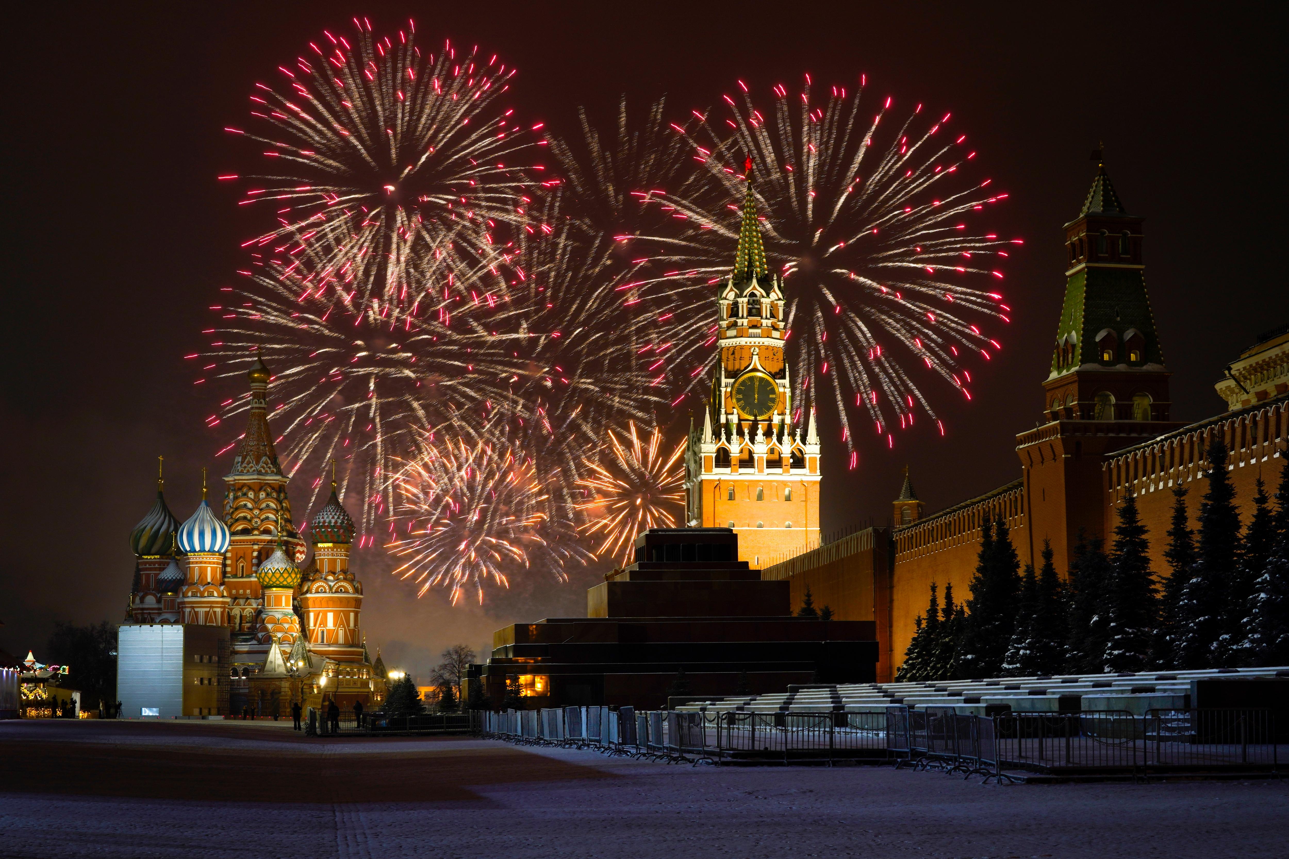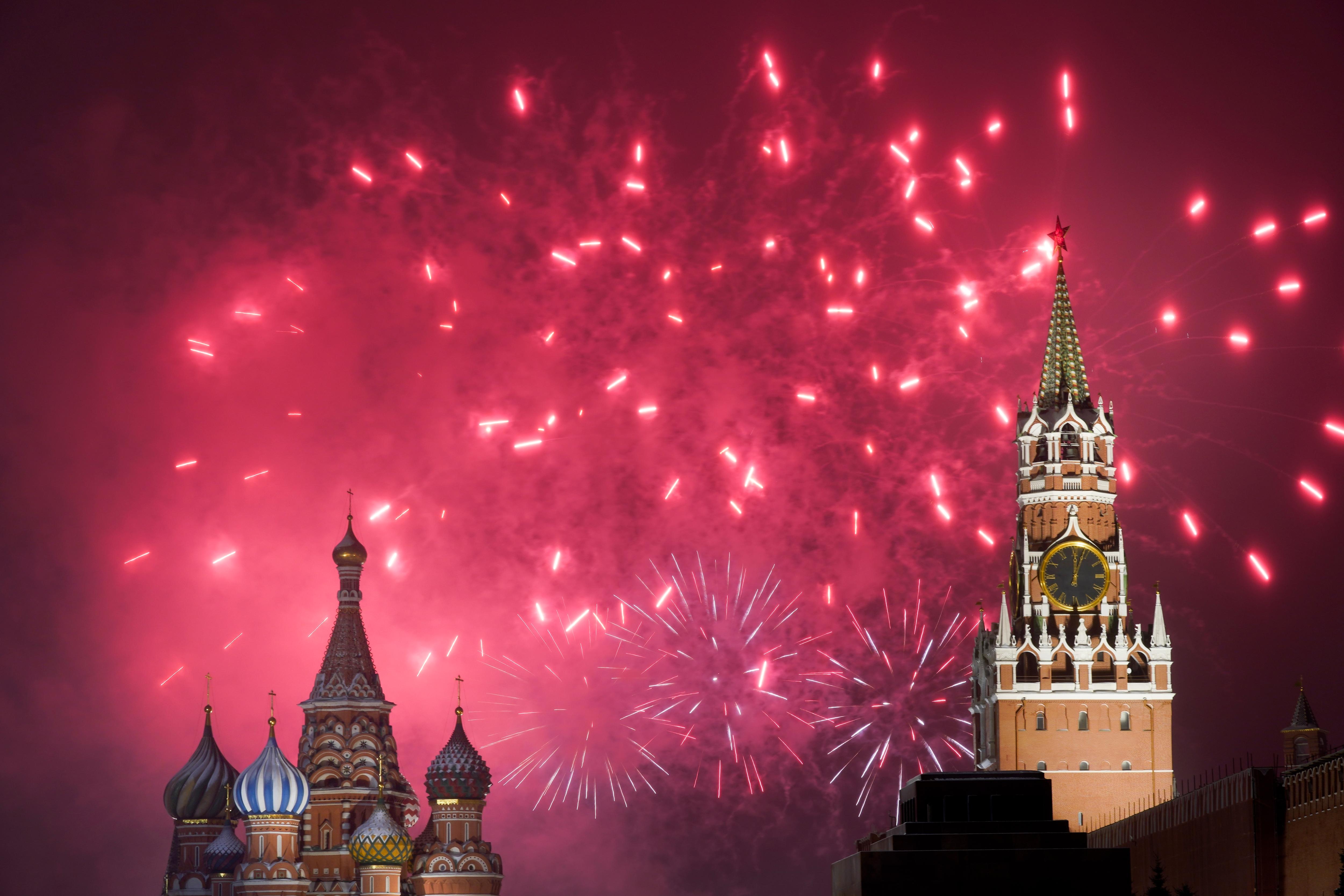Moscow celebrated with fireworks over an empty Red Square due to pandemic restrictions.