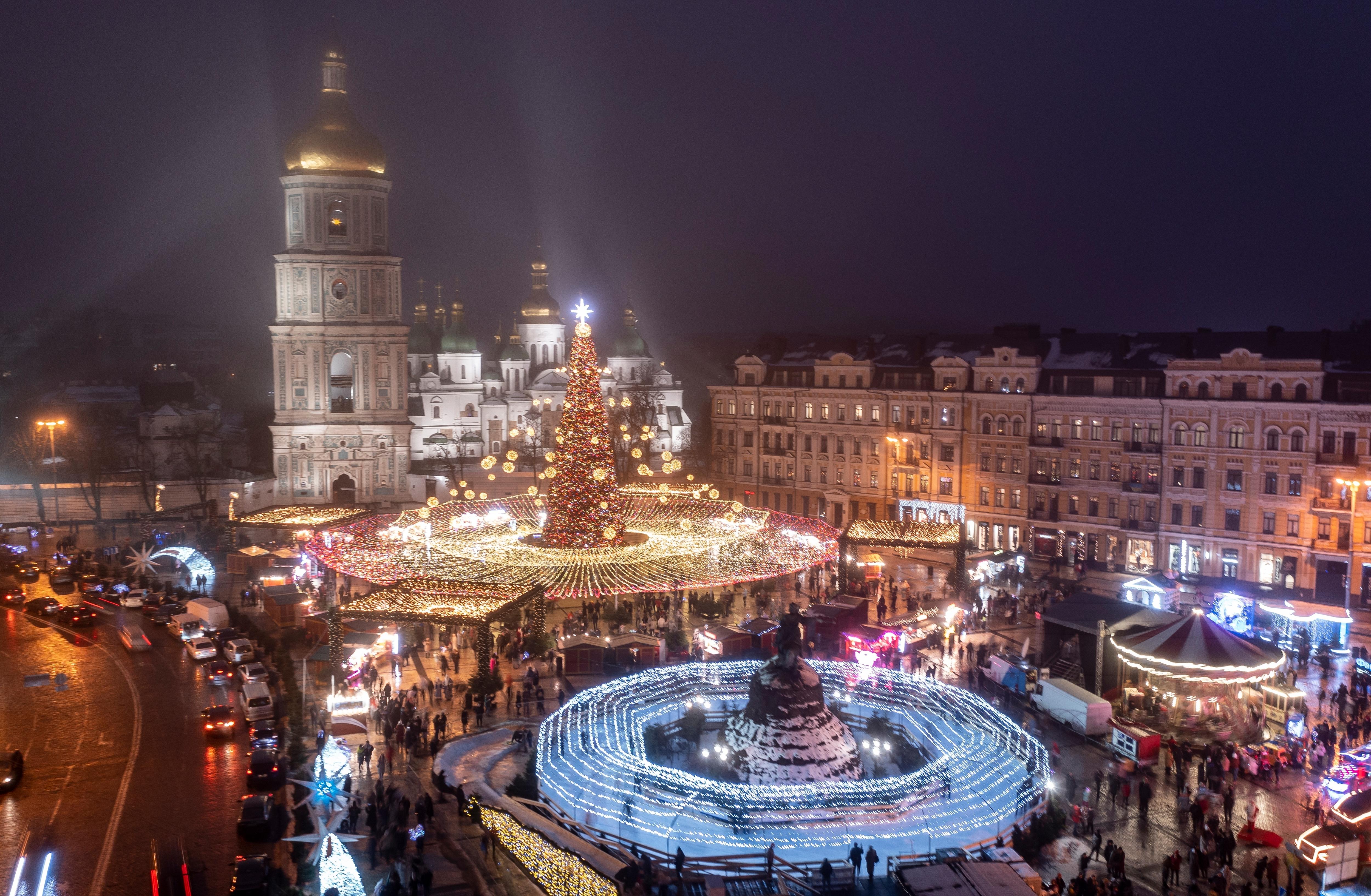 Crowds of people celebrated beside a giant Christmas tree in Kyiv in front of the Saint Sofia Cathedral.