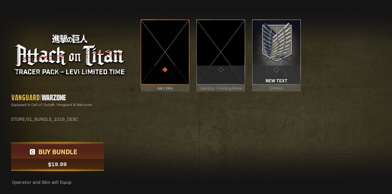 While the crossover and bundle information has yet to be officially announced, an Attack on Titan listing was temporarily available in the Warzone store before swiftly being taken down in December 2021. It featured a Levi Tracer Pack with a skin, Operator finishing move, and emblem.