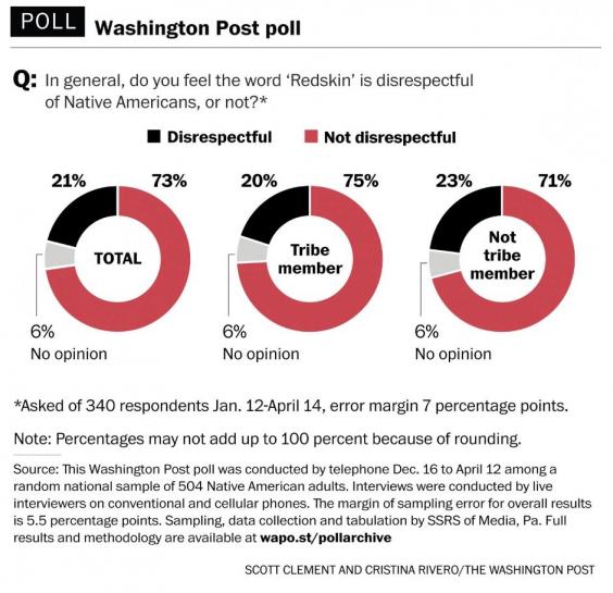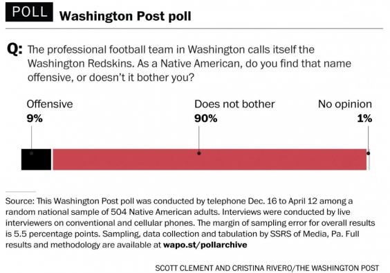 In a 2014 national ESPN poll, 23 percent of those reached called for “Redskins” to be retired because of its offensiveness to Native Americans — more than double the 9 percent of actual Native Americans who now say they are offended by it.