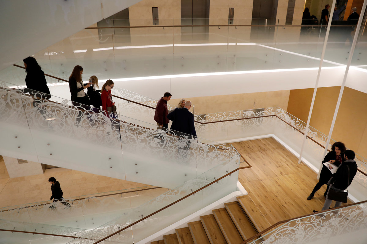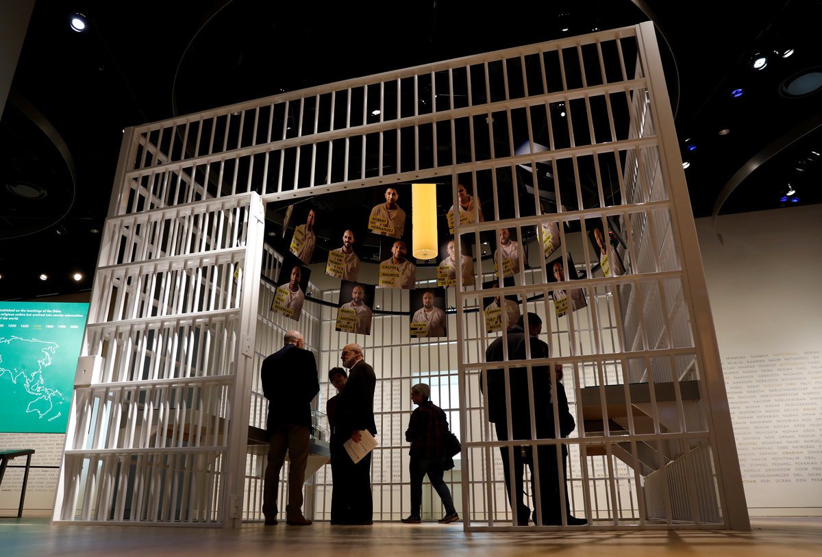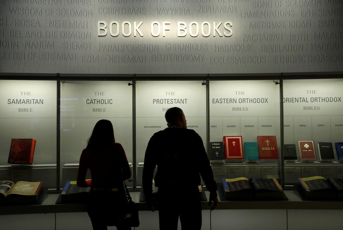 Visitors stand in the entrance hall at the Museum of the Bible during a preview day in Washington, U.S., November 14, 2017. REUTERS/Kevin LamarqueA visitor looks at various Bibles during a preview at the Museum of the Bible in Washington, U.S., November 14, 2017. REUTERS/Kevin LamarqueWith ancient scrolls as a backdrop, Israeli Eliezer Adam works with ink and feather copying the Five Books of Moses which he says will take a year, at the Museum of the Bible in Washington, U.S., November 14, 2017. REUTERS/Kevin LamarqueVisitors stand inside a prison cell exhibit during a preview at the Museum of the Bible in Washington, U.S., November 14, 2017. REUTERS/Kevin LamarqueA visitor stands near Torah scrolls on display during a preview at the Museum of the Bible in Washington, U.S., November 14, 2017. REUTERS/Kevin LamarqueA worker climbs a ladder beside Torah scrolls on display during a preview at the Museum of the Bible in Washington, U.S., November 14, 2017. REUTERS/Kevin LamarqueVisitors make their way through the main atrium during a preview at the Museum of the Bible in Washington, U.S., November 14, 2017. REUTERS/Kevin LamarqueVisitors make their way through the main atrium during a preview at the Museum of the Bible in Washington, U.S., November 14, 2017. REUTERS/Kevin LamarqueVisitors enter an exhibit room during a preview at the Museum of the Bible in Washington, U.S., November 14, 2017. REUTERS/Kevin LamarqueA man takes a photo at an exhibit room during a preview of the Museum of the Bible in Washington, U.S., November 14, 2017. REUTERS/Kevin LamarqueA visitor enters an exhibit room during a preview at the Museum of the Bible in Washington, U.S., November 14, 2017. REUTERS/Kevin LamarqueChildren play with an interactive exhibit during a preview at the Museum of the Bible in Washington, U.S., November 14, 2017. REUTERS/Kevin LamarqueA woman looks at a video exhibit during a preview day at the Museum of the Bible in Washington, U.S., November 14, 2017. REUTERS/Kevin LamarquePeople walk through an exhibit room during a preview day at the Museum of the Bible in Washington, U.S., November 14, 2017. REUTERS/Kevin LamarqueA worker mops the floor during a preview day at the Museum of the Bible in Washington, U.S., November 14, 2017. REUTERS/Kevin LamarqueA woman sits outside an exhibit room during a preview of the Museum of the Bible in Washington, U.S., November 14, 2017. REUTERS/Kevin LamarqueA couple look at a Bible display during a preview of the Museum of the Bible in Washington, U.S., November 14, 2017. REUTERS/Kevin LamarquePeople pass the Museum of the Bible, which opens to the public later this week, in Washington, U.S., November 14, 2017. REUTERS/Kevin LamarqueA woman looks at a Bible during a preview of the Museum of the Bible in Washington, U.S., November 14, 2017. REUTERS/Kevin Lamarque