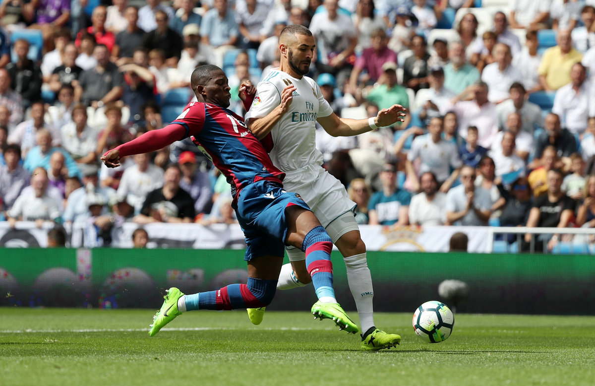 Soccer Football - Spanish La Liga Santander - Real Madrid vs Levante - Madrid, Spain - September 9, 2017 Levante’s Jefferson Lerma in action with Real Madrid’s Karim Benzema REUTERS/Susana Vera