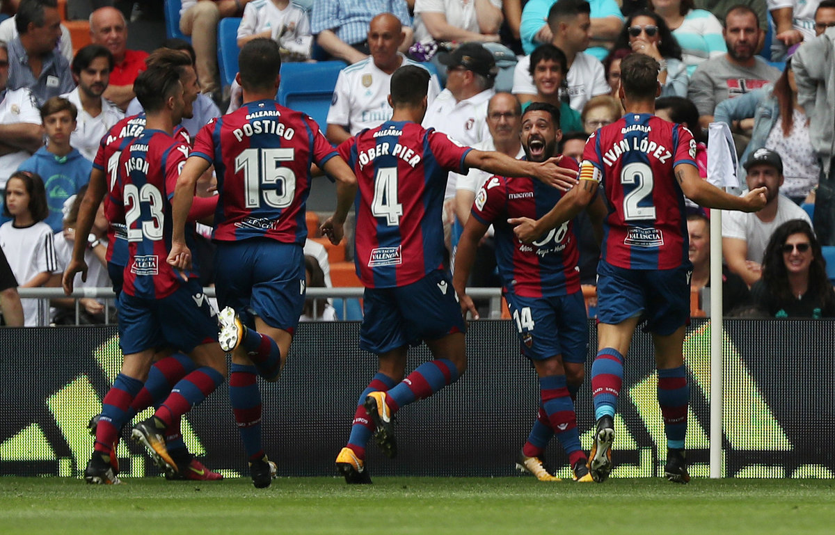 Soccer Football - Spanish La Liga Santander - Real Madrid vs Levante - Madrid, Spain - September 9, 2017 Levante’s Ivi celebrates scoring their first goal with team mates REUTERS/Susana Vera