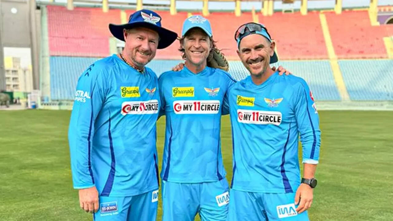 LSG's head coach Justin Langer, assistant coach Lance Klusener and fielding coach Jonty Rhodes couldn't resist shaking a leg when the DJ played the famous Punjabi number 'bolo tara ra ra' by pop singer Daler Mehndi.
